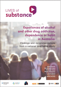 Funded by the Australian Research Council, the project collected in-depth qualitative interviews with 60 people who described themselves as having an alcohol or other drug addiction, dependence or habit. Participants were screened to include only those who would receive a diagnosis of substance use disorder or dependence syndrome using the Diagnostic and Statistical Manual of Mental Disorders (DSM-5) or the International Classification of Diseases (ICD-10) criteria.