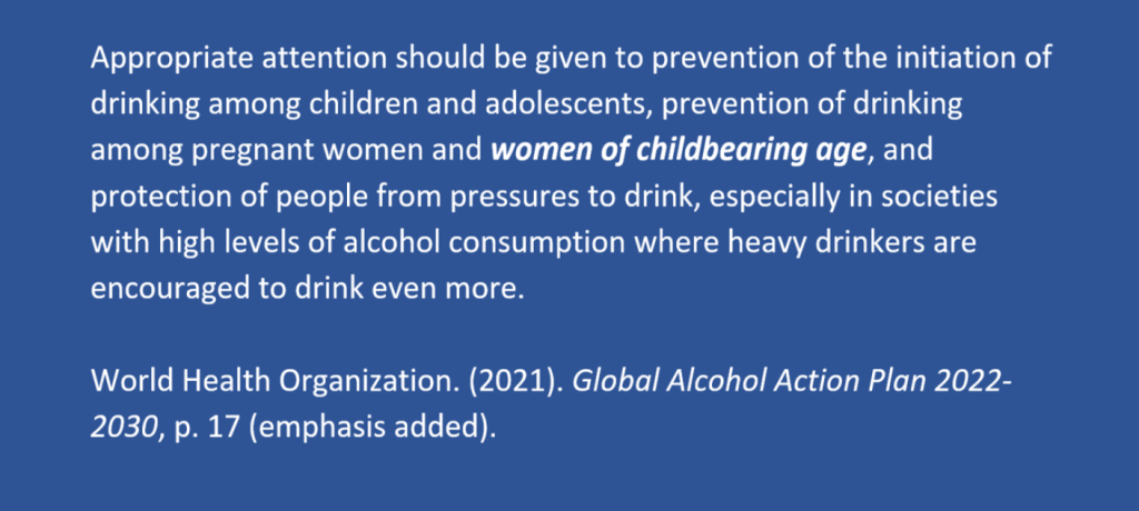 The recommendation that drinking be prevented ‘among pregnant women and women of childbearing age’ (p. 17, emphasis added) requires critical scrutiny. The singling out of the majority of women for special attention and restrictions is starkly inconsistent with data cited elsewhere in the Plan. These data suggest that if any gender should be the target of specific policy attention and initiatives, it is men.