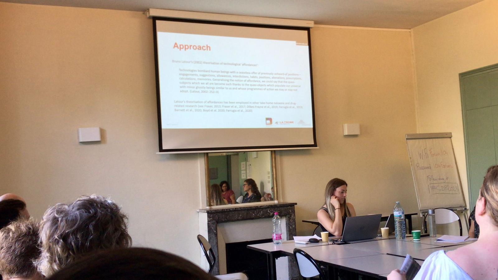 Dr Nyssa Ferguson presented research conducted for her PhD (also attached to an ARC-funded project) on take-home naloxone training in Victoria, Australia. Entitled ‘Remaking the angry Narcanned subject: Affording new subject positions through take-home naloxone training’, she worked with Bruno Latour’s theorisation of technological ‘affordances’, which suggests that technologies are co-produced within social relations, and ‘afford’ rather than determine specific actions, possibilities, and subject positions, Nyssa argued what she called the ‘angry Narcanned subject’ has come to hold a powerful position in understandings of naloxone. Nyssa examined how take-home naloxone peer trainers work hard to trouble simplistic causal links commonly drawn between naloxone, conflict and distress and, in doing so, drew attention to the ways in which training affords multiple, new subject positions for consumers.