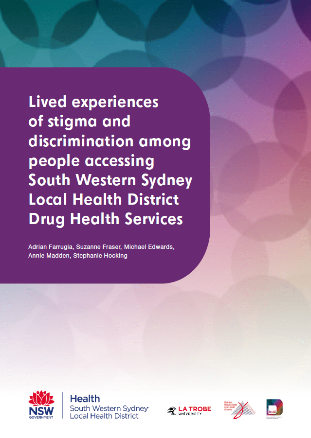 Farrugia, A., Fraser, S., Edwards, M., Madden, A. & Hocking, S. (2019). Lived experiences of stigma and discrimination among people accessing South Western Sydney Local Health District Drug Health Services. Melbourne: The Australian Research Centre in Sex, Health and Society, La Trobe University.
