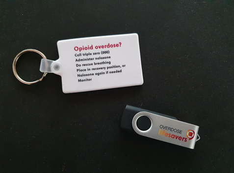 Alongside Overdoselifesavers.org, this project produced keyrings with backing cards summarising the steps for responding to opioid overdose, and USB drives containing the final report and recommendations for future overdose policy and practice.